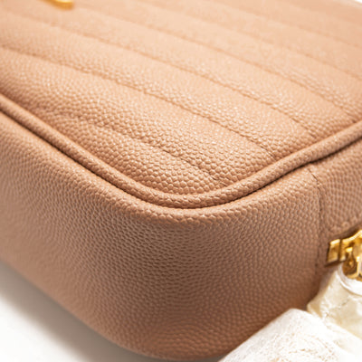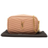 This is an authentic SAINT LAURENT Grain De Poudre Matelasse Monogram Mini Lou Camera Bag in Peach. This chic shoulder bag is crafted of beautiful textured calfskin leather in peach. This features a cross-body strap, gold hardware, and a decorative tassel zipper pull. The top zipper opens to a compact black leather interior with card slots.