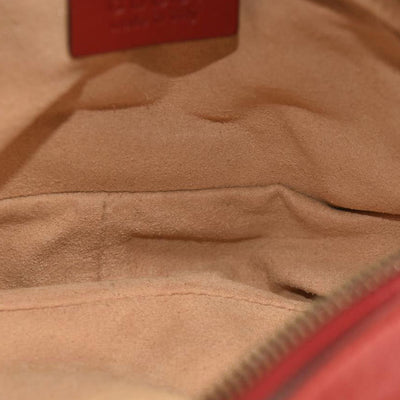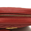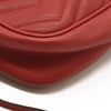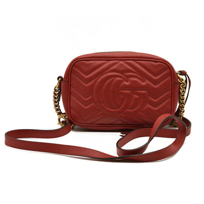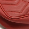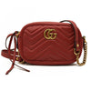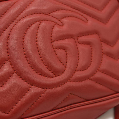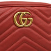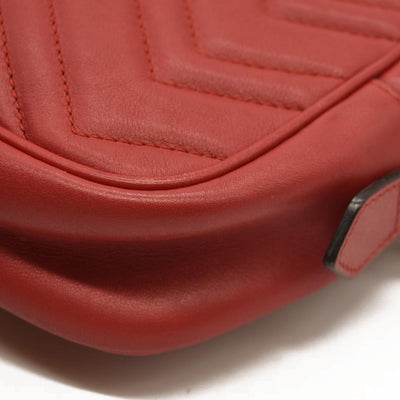 This is an authentic GUCCI Calfskin Matelasse Small GG Marmont Chain Shoulder Bag in Hibiscus Red. This shoulder bag is crafted of chevron-quilted calfskin leather in red, with a prominent Gucci GG logo stitched on the back. The bag features an aged gold chain and leather shoulder strap, and a matching gold GG logo on the front. The top zipper opens the bag to a beige microfiber interior with a patch pocket.