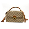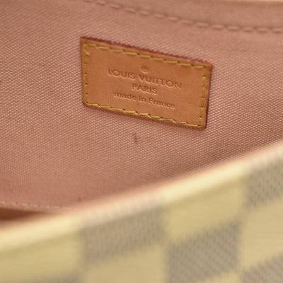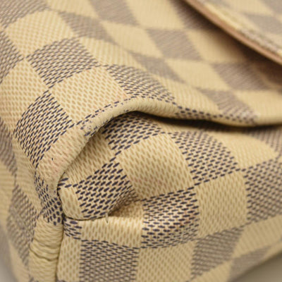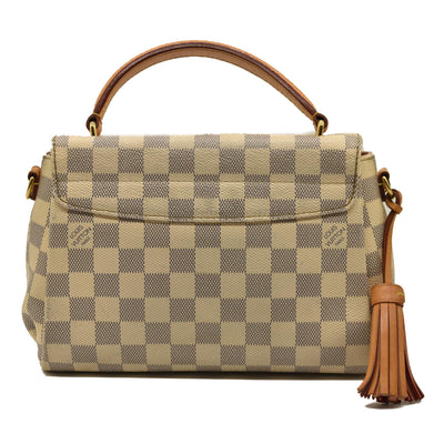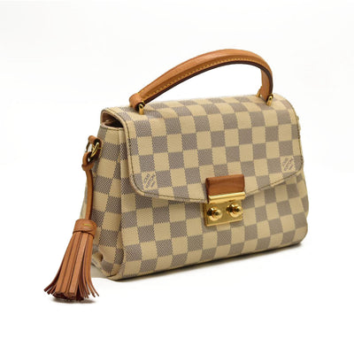 This is an authentic LOUIS VUITTON Damier Azur Croisette. This compact tote is crafted of Louis Vuitton Damier coated canvas in blue and white. The bag features signature vachetta cowhide leather trim including a top handle with a removable tassel, and an optional shoulder strap with gold plated hardware. The crossover flap opens with a push lock to a ballerina pink fabric interior with a patch pocket.
