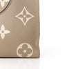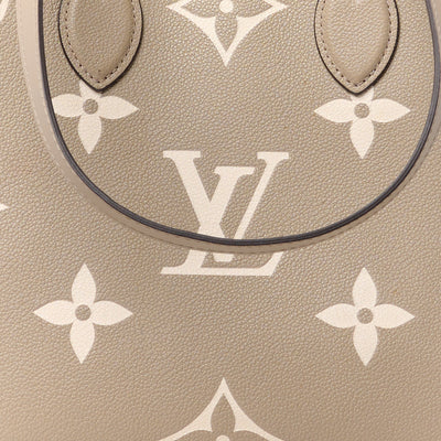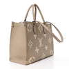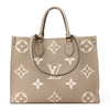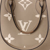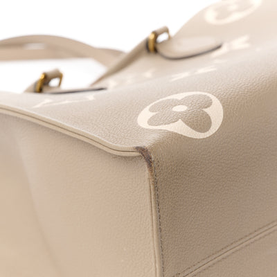 This is an authentic LOUIS VUITTON Empreinte Monogram Giant Onthego MM Tourterelle in Creme. This limited edition tote is crafted of oversized ivory Louis Vuitton monogram print embossed on taupe calfskin leather. The bag features rolled leather top handles, long strap handles, and gold-tone hardware. The top is open to a spacious taupe microfiber interior with zipper and patch pockets.