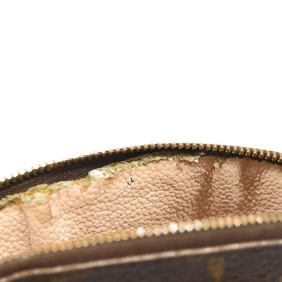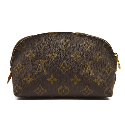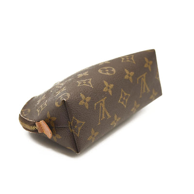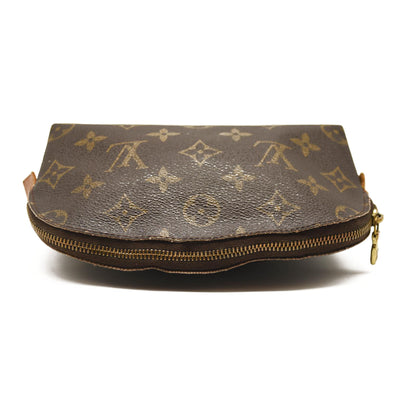 This is an authentic LOUIS VUITTON Monogram Cosmetic Pouch. This stylish pouch is crafted of classic Louis Vuitton monogram on toile canvas. The pouch features a polished brass top zipper that opens to a beige leather-like interior with a patch pocket.