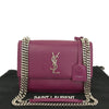 This is an authentic SAINT LAURENT Calfskin Medium Monogram Sunset in Purple. This stunning shoulder bag is crafted of grained calfskin in purple. The bag features a coated silver chain strap with a shoulder pad, a front facing flap with a signature silver YSL logo, gusseted sides and both an interior and exterior pocket. This fold-over bag is complete with magnetic snap that opens to a suede interior. This cross body bag is ideal for daytime or evening wear only from Saint Laurent!