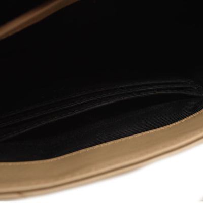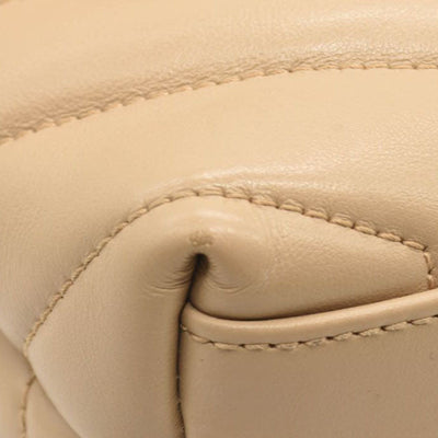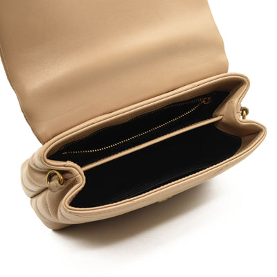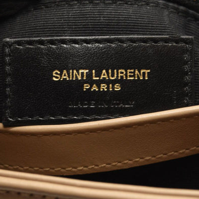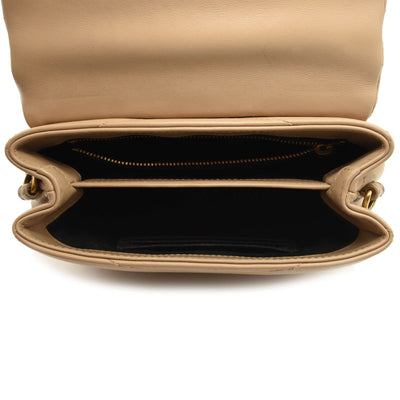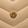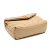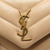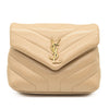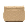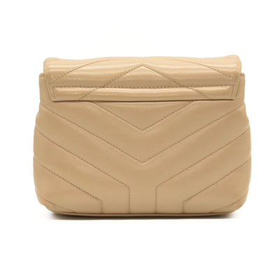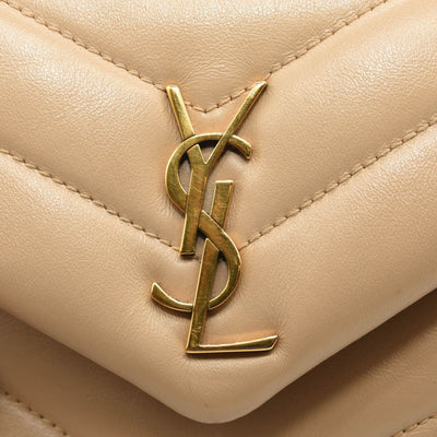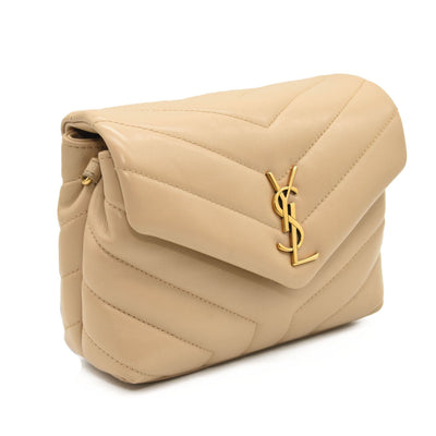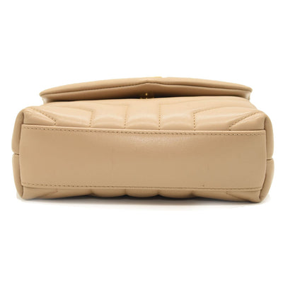 This is an authentic SAINT LAURENT Calfskin Y Quilted Monogram Toy Loulou Crossbody Bag in Dark Beige. This elegant shoulder bag is crafted of chic chevron quilted calfskin leather in beige. The bag features a leather shoulder strap and gold hardware. The front flap features a prominent gold YSL monogram detail and opens to a partitioned black fabric interior with zipper and patch pockets.