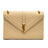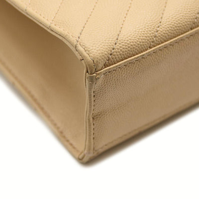 This is an authentic SAINT LAURENT Grain De Poudre Mixed Matelasse Large Triquilt Monogram Satchel in Nude Powder. This elegant shoulder bag is crafted of beautifully pebbled chevron quilted calfskin leather in beige. The bag features polished gold hardware, a gold chain-link shoulder straps with leather shoulder pads, and a gold YSL emblem on the front flap. The flap opens to a black fabric interior with a zipper pocket. This handbag is ideal for everyday use, from Saint Laurent!