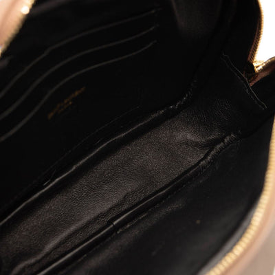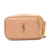 This is an authentic SAINT LAURENT Grain De Poudre Matelasse Monogram Mini Lou Camera Bag in Peach. This chic shoulder bag is crafted of beautiful textured calfskin leather in peach. This features a cross-body strap, gold hardware, and a decorative tassel zipper pull. The top zipper opens to a compact black leather interior with card slots.
