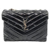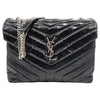 We guarantee this is an authentic SAINT LAURENT Patent Quilted Monogram Medium Loulou Chain Satchel Black or 100% of your money back. This elegant shoulder bag features patent chevron quilting at both the front and the back in black. The bag features a matte silver chain-link shoulder strap with a matching leather shoulder pad. The flap features a prominent matte silver YSL monogram detail and opens to a partitioned black fabric interior with zipper pockets. This is an ideal bag for your collection for day or evening, with the classic chic only from Yves Saint Laurent!
