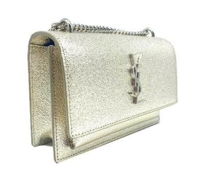 MONOGRAM SAINT LAURENT FLAP FRONT CHAIN WALLET IN GRAINED METALLIC LEATHER WITH ACCORDION SIDES, METAL INTERLOCKING YSL SIGNATURE AND LEATHER AND CHAIN SHOULDER STRAP.