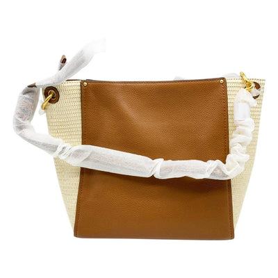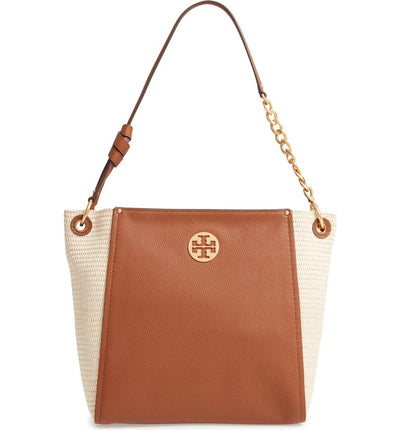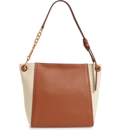 Pebbled leather and woven straw contrast on this roomy hobo bag, providing the perfect balance of city refinement and rustic charm. Stacked-T medallion hardware and a chain-detailed shoulder strap keep it in polished territory.