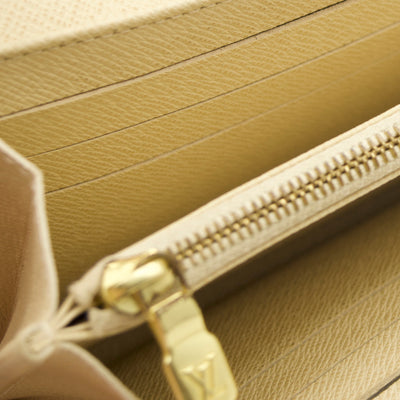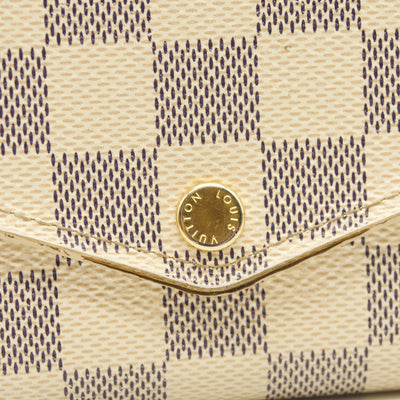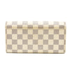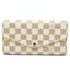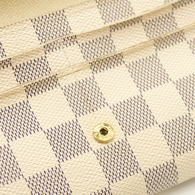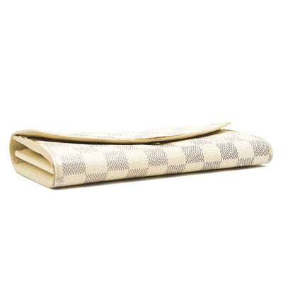This is an authentic LOUIS VUITTON Damier Azur Sarah Wallet NM. This stylish wallet is crafted of Louis Vuitton signature damier on toile canvas in blue and white. The envelope-style crossover flap snaps open to a partitioned ivory crossgrain leather interior with card slots, patch pockets, and a zipper compartment.