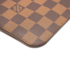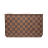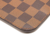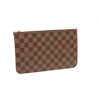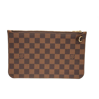 This is an authentic LOUIS VUITTON Damier Ebene Neverfull PM Pochette. This stylish wristlet is crafted of signature Louis Vuitton Damier coated canvas. The pouch features a brown leather wristlet strap and a polished gold top zipper that opens to a red-striped fabric interior with a patch pocket.